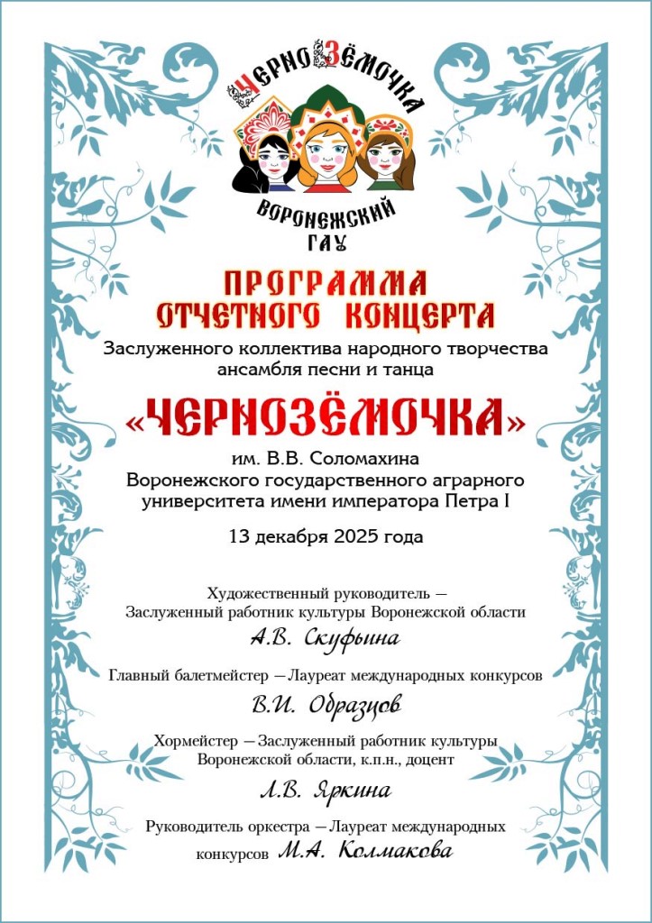 Коллектив ансамбля «Черноземочка» приглашает всех любителей народного творчества на 61-й отчетный концерт, который состоится в субботу 13 декабря 2025 года в Большом концертном зале ВГАУ (Южный корпус) по адресу ул. Ломоносова, 81Д. Зрителей ждут новые яркие хоровые и танцевальные номера в сопровождении оркестра русских народных инструментов, а также композиции, вошедшие в «золотой фонд» ансамбля «Черноземочка».