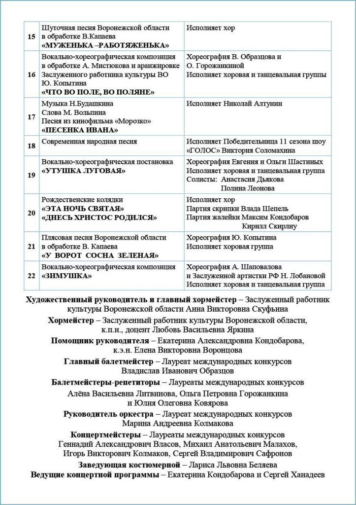 Так же по традиции в этот же день после отчетного концерта будет организован праздничный капустник, который будет проходить в столовой «Околица» ВГАУ. Стоимость билета на капустник можно уточнить по телефону +7(952) 956-54-90 в орг. комитете ансамбля.